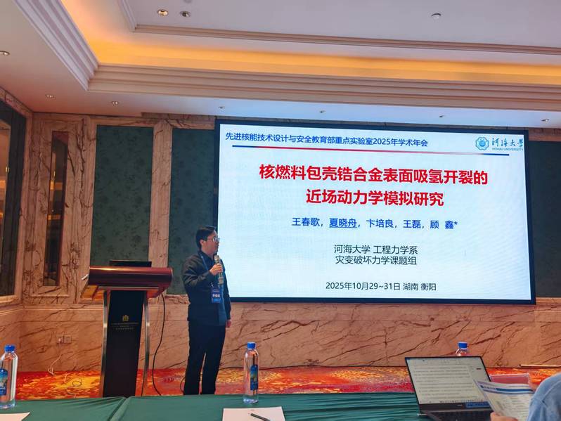 在“模拟仿真与核应急相关软件研发&严重事故软件开发与模型评估”专题分会场中,课题组积极参与交流。夏晓舟副教授作了题为《核燃料包壳锆合金表面吸氢开裂的近场动力学模拟研究》的学术报告,系统介绍了锆合金吸氢开裂与损伤断裂分析中的关键挑战、热-力-氢耦合的近场动力学建模方法及相关研究成果。该分会场汇聚了来自中广核研究院、清华大学核研院、上海交通大学、国家电投集团科学技术研究院、中核武汉核电运行技术股份有限公司、上海核工程研究设计院等多家单位的专家学者,呈现了多个前沿方向的研究进展与实践案例。课题组师生通过深入参与研讨,进一步掌握了事故分析程序、反应堆多物理场耦合分析等关键技术,展现了灾变破坏力学团队良好的学术风貌,也加深了对核工程领域发展动态的理解。